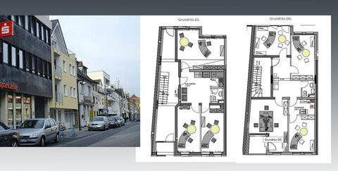 - Die Büroflächen im EG verfügen über einen Flur/Empfangsbereich, 3 Büroräume, WC und eine Teeküche