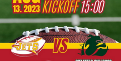 erstes Heimspiel der Rückrunde 2023! Am 13. August, um 15:00 Uhr, empfangen die Jets die Bielefeld Bulldogs im Aggerstadion.