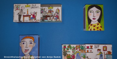 Antje Damm ist als vielseitige Bilderbuchkünstlerin bekannt. In der Pandemie begann sie, kleine Alltagszenen und Panoramen in Streichholzschachteln zu gestalten. Diese fantastischen Mini-Welten schauen wir uns gemeinsam in der Ausstellung an und gestalten dann selbst eine Szene in einer Schachtel – dafür wagen wir uns allerdings an etwas größere Formate wie Schuhkartons, Pappschachteln und Co.