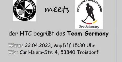 Am Samstag, den 22.04.2023 findet auf der Vereinsanlage Carl-Diem-Straße ein Vorbereitungsspiel der Nationalmannschaft Deutschlands im Specialhockey gegen eine Jugendauswahl des HTC statt.